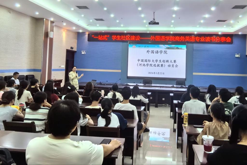 为激发学生的创新思维和创业热情,5月22日晚,外国语学院在图书馆122会议室召开中国国际大学生创新大赛(2024)动员会。学院党委副书记周茜主持,副院长钟伟轩、商务英语教研室主任罗潇潇和商务英语专业学生共同参与。