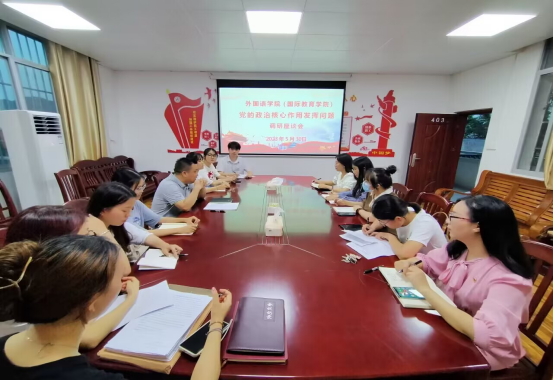 为深入了解外国语学院(国际教育学院)党的政治核心作用发挥情况,全面掌握党在学院改革与发展中政治核心作用,2023年5月30日19:30,外国语学院(国际教育学院)于西区外语楼403会议室开展党的政治核心作用发挥问题调研座谈会。此次座谈主调研人为学院党委书记覃春华,13名师生党员代表参加。