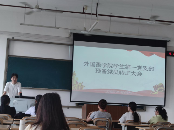 6月20日下午,外国语学院(国际教育学院)学生第一党支部在格致楼601教室召开预备党员转正大会,会议由支部助理蓝欣欣主持,支部全体党员共同参会。