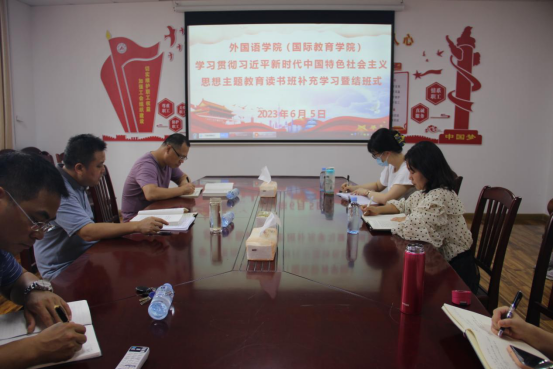 6月5日下午,外国语学院(国际教育学院)党委中心组在外语楼403会议室召开学习贯彻习近平新时代中国特色社会主义思想主题教育读书班补充学习暨结班仪式?;嵋橛裳г旱澄榧邱夯鞒郑澄行淖槿宄稍辈渭友?。