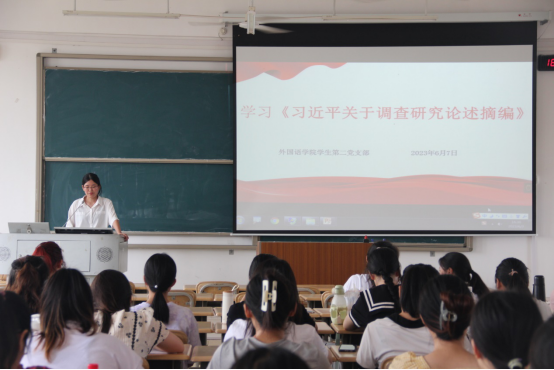 6月7日下午,外国语学院(国际教育学院)学生第二党支部在格致楼601教室召开学习《习近平关于调查研究论述摘编》的党日活动?;嵋橛芍Р渴榧侵芄罅鲜χ鞒?,支部全体成员参加学习。