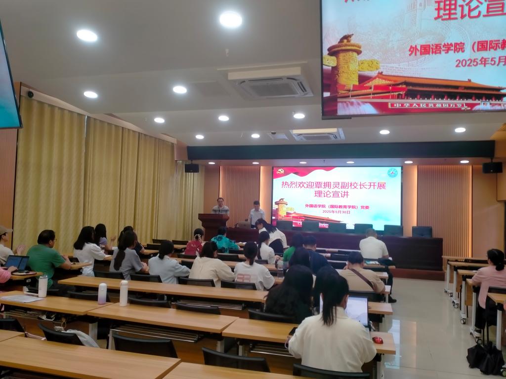 5月30日下午,学校党委常委、副校长覃拥灵在格致楼101教室开展理论宣讲。外国语学院党员师生代表、民主党派代表和无党派人士代表等参加宣讲会。宣讲会由外国语学院党委书记韦合教授主持。