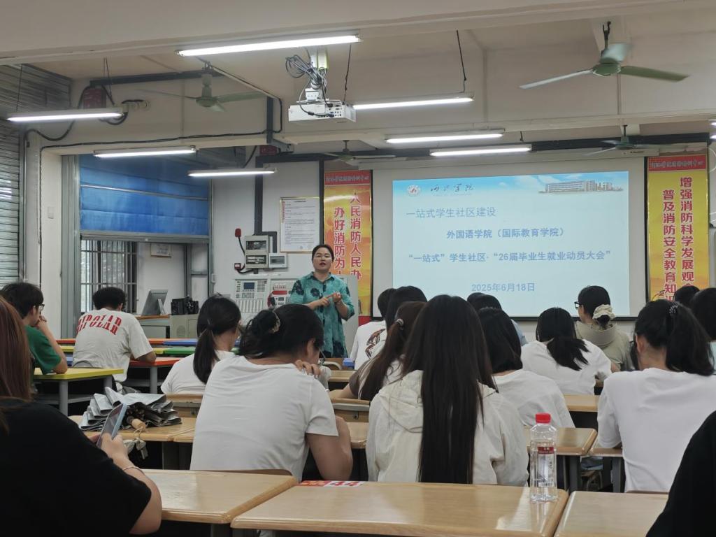 2025年6月18日,外国语学院(国际教育学院)“一站式”学生社区·“2026届毕业生就业动员大会”在外语楼205举行。大会由学院党委副书记周茜老师主持,26届毕业生出席会议。